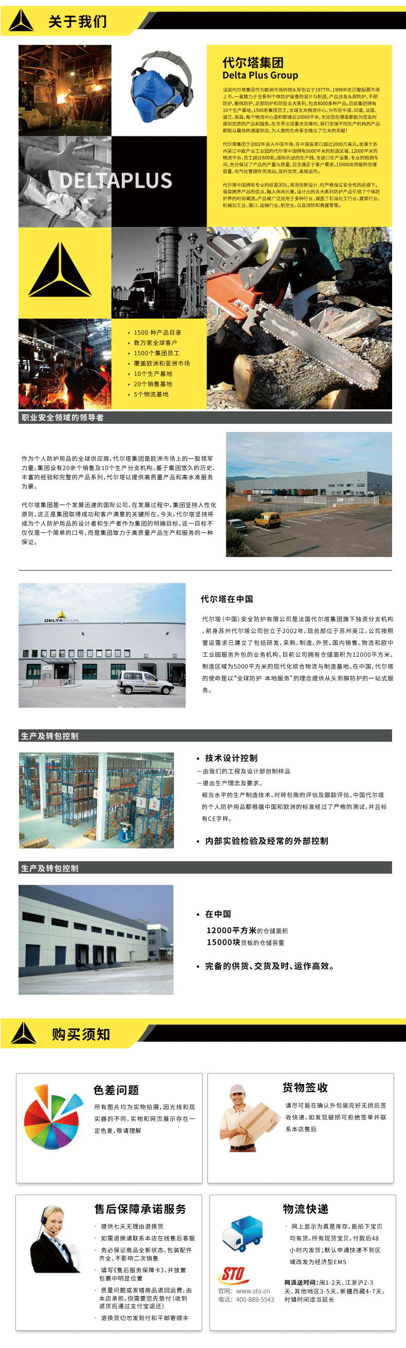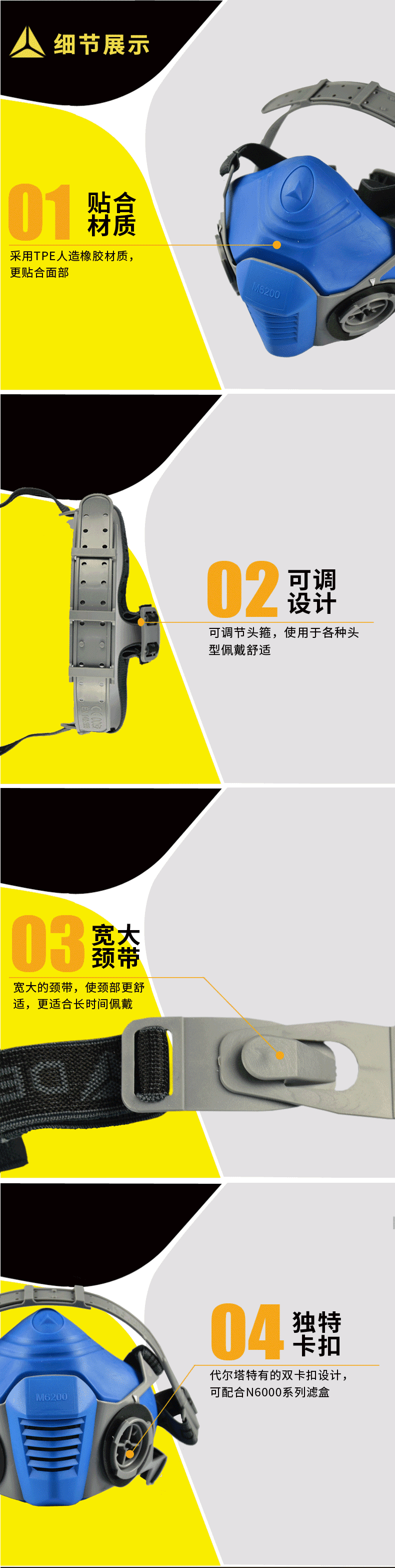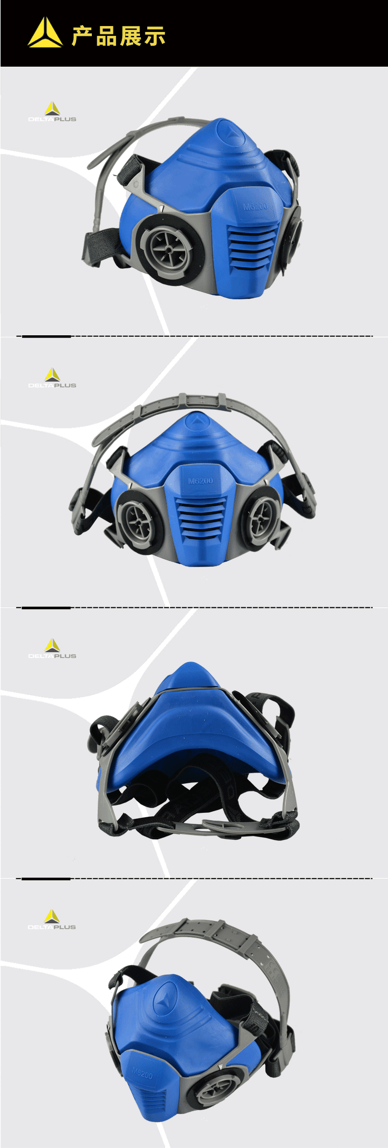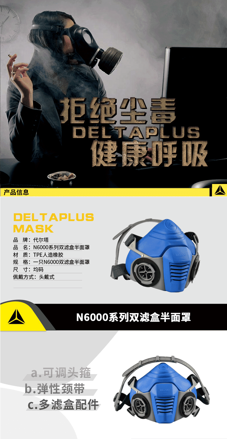 代尔塔105006 M6000双滤盒半面罩,TPE材质半面罩,弹性头颈带设计,带有可调节松紧头箍,可配合单独出售的M6000系列高容量滤盒使用。