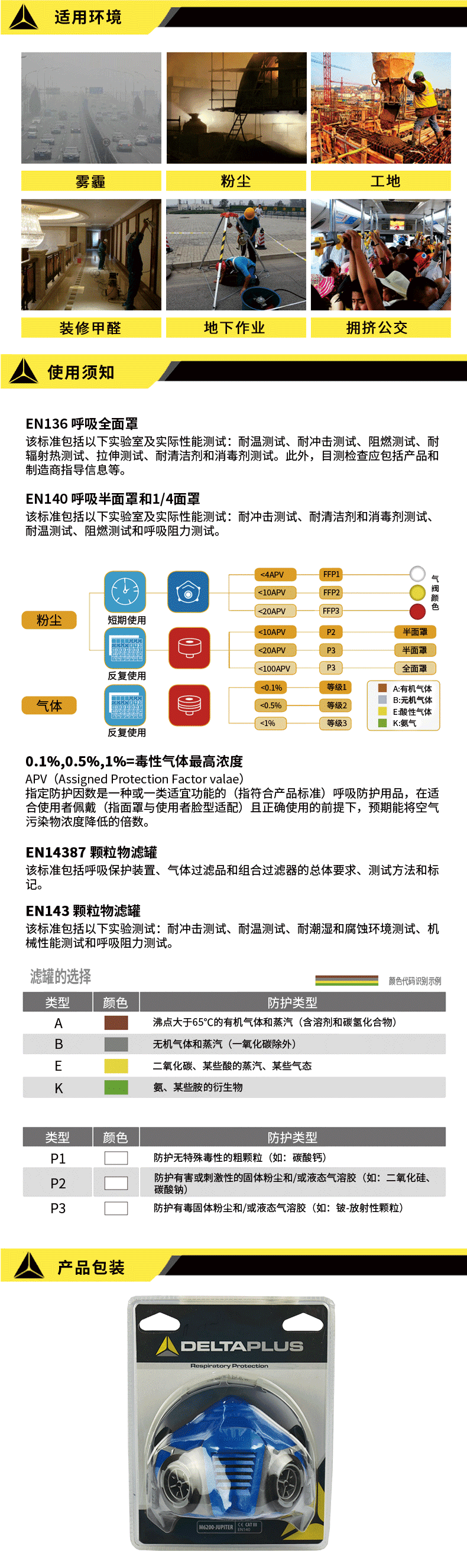 半面罩可用于防护粉尘、蒸汽和气体。建议当离开污染区域后仍继续佩戴面罩,直到衣服上的残留污染物完全消失。