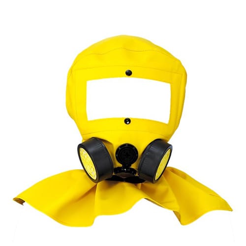 由双罐式口罩附滤毒罐,外加头巾制成