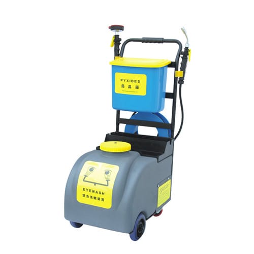 先把水箱加满水,盖好水箱盖子,视事故的伤害程度选择好使用洗眼器喷头还是喷枪,检查各连接部位是否连接好,开启电源开关,按需要随意抽出并握紧手柄即可喷出雾化水进行冲洗,松开手柄自动关闭。