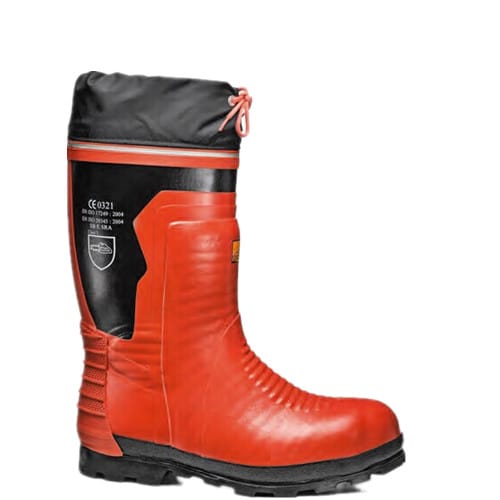 防电锯安全靴,硫化橡胶材料,前方和侧面具有防电锯功能,棉帆布内衬,防砸,耐酸碱。EN认证。