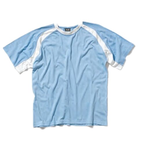全棉,特种精梳棉,克重140g/m2,圆领,蔚蓝色衣身,领圈和肩部白色镶拼。