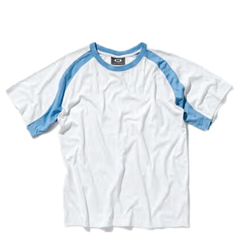 全棉,特种精梳棉,克重140g/m2,圆领,白色衣身,领圈和肩部蔚蓝色镶拼。