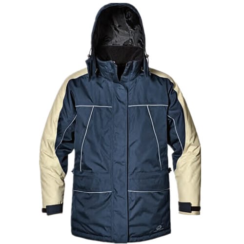 保暖外套,防水透气涤纶外层,菱格纹里层,内胆克重180g/m2,折叠隐蔽式风帽,抽绳腰部和下层,可调节袖口。