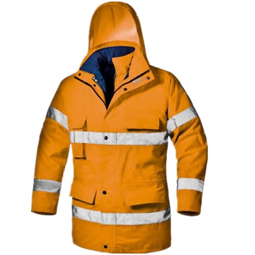 橙色高能见度外套,四合一款式,PU涂层涤纶外层,可脱卸式针织涤纶内胆衣,羊毛内。折叠隐蔽式风帽,多功能口袋。