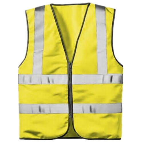 黄色高能见度背心,100%涤纶,190g/m2,拉链前襟。尺码M-XL。