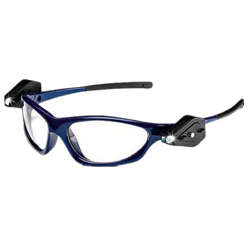 安全眼镜,蓝色镜架,透明PC镜片,耐磨,防雾,两侧镜腿装有LED灯,9瓦,电池寿命25小时,可更换。