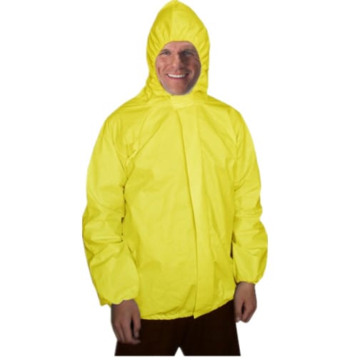 面料: 亮黄色高密度聚乙烯膜(HDPE)+纺粘聚丙烯无纺布(纺粘PP)---87克/平米 典型应用: 承压清洗作业;化学容器清洗作业;农业喷洒作业及农业处理;有害干燥颗粒处理作业;低毒化学物质混合配制;化学品处理;抗血液及病菌的渗透