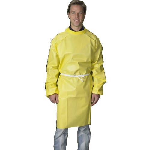 面料: 亮黄色高密度聚乙烯膜(HDPE)+纺粘聚丙烯无纺布(纺粘PP)---87克/平米 典型应用: 承压清洗作业;化学容器清洗作业;农业喷洒作业及农业处理;有害干燥颗粒处理作业;低毒化学物质混合配制;化学品处理;抗血液及病菌的渗透 71cm(宽)×91cm(高);长袖;反穿;系带