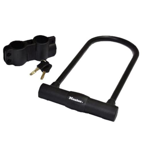 玛斯特Master 自行车、摩托车锁 U形锁8170D 技术参数: 160mm宽黑色钢锁体,锁钩直径13mm,净高205mm,钥匙开启。 产品特点: 1.钢锁体有着高强度 2.淬硬钢锁钩防剪切 3.乙烯基包胶锁体和锁钩,防刮花 产品应用: 适用于自行车、摩托车、大门等。