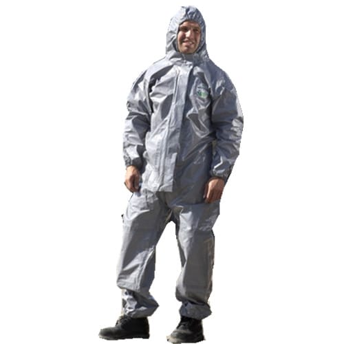 面料: 灰色EVOH防化膜+纺粘聚丙烯无纺布(纺粘PP)---170克/平米 典型应用: 高危害化学品及化学废置物处理;工业拆除作业;石化工业;生化武器典型应用;反恐典型应用等 欧标3、4类认证; 通过EN 1149(防静电标准)、EN 340检测; 手腕,脚踝,帽口上为橡筋收口;热合胶带封边。