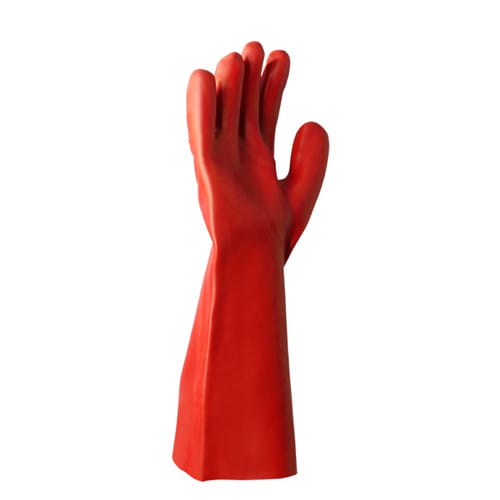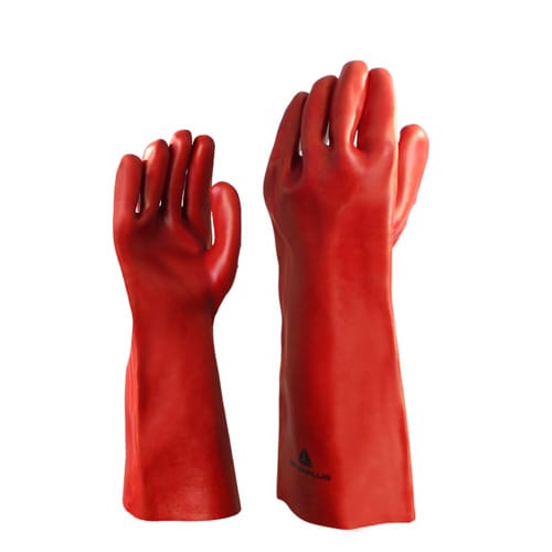 品名:代尔塔 201402 PVCC400防化手套 产品特性:40厘米PVC防微生物加强硫化手套,针织棉衬里,佩戴舒适,耐寒、耐磨损,使用寿命长,对大多数化学品可提供高性能防护。 颜色:红色 材料:100%红色硫化PVC涂层针织棉衬里; 厚度:1.3毫米 使用说明:多功能保护手套可对机械风险提供较高保护,可以防止化学危害、微生物(如真菌、细菌)风险,耐水、透气,同时可以避免接触热危害。