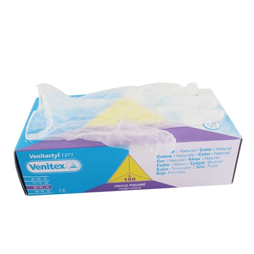 特点:灵巧型PVC一次性防护手套,每盒50副。100%PVC材质,搽有玉米淀粉,可与食物接触。厚度: 0.125mm。AQL 1.5。