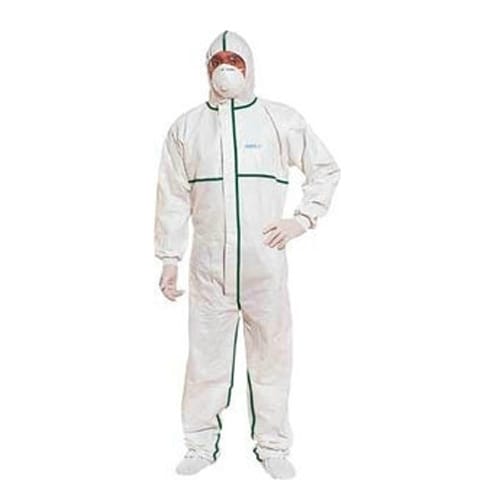 本产品专门用于防护有毒干燥微粒及化学液体喷溅,可用于存在石棉、酸碱性物质的工作环境。属于III类PPE产品,符合欧标4&5&6类防护服等级要求。为达到最佳防护,建议穿着者在袖口、脚踝口使用溶剂防护胶条,同时佩戴的口罩,与兜帽接触处,请贴上同样的胶条。防护手套必须遮住袖口。