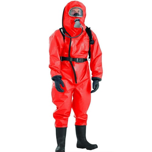 保护服可以保护穿戴者免受液体和气态化学物的侵害,包括液体溶胶和固体颗粒。使用前,检查以确保呼吸器正常工作。将保护服完全打开,先穿底部,再穿袖子,接着穿头部。调整面罩。将防护服完全关闭(头部和背部)。安装并调节呼吸装置。将呼吸装置和面罩连接并打开阀门。
