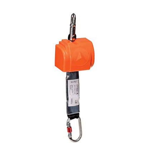 收缩式速差防坠器,配有万向轴,高强度ABS防护外盒,缓冲带宽度为46毫米。最大展开长度6米。