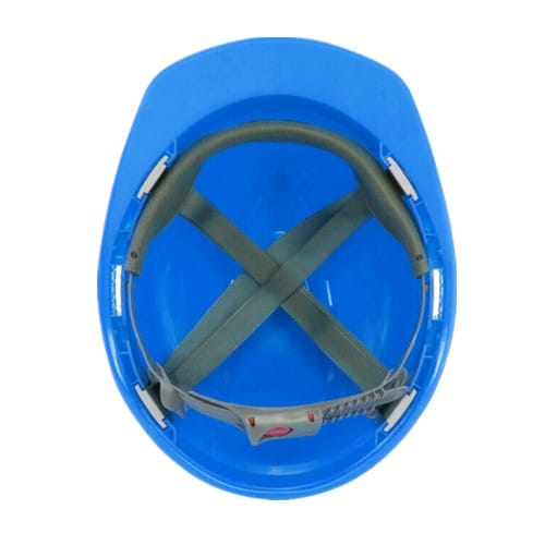产品描述:蓝色ABS帽壳,一指键帽衬针织布吸汗带,C型下颏带