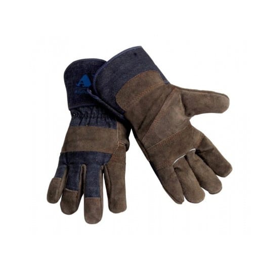 掌位部分采用耐磨、抗穿插的金黄色牛二层皮,手背部分采用耐用美观的牛仔布,内里采用舒适吸汗的棉质内里,双线缝制耐用性高。