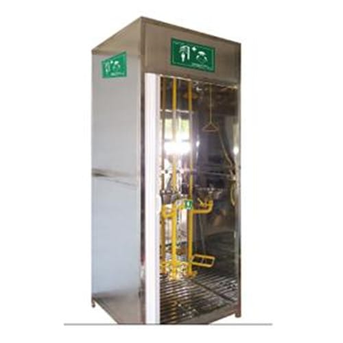 WS682加强型紧急洗消房:全不锈钢结构,PVC推拉门,含蓄水托盘(可选配WS690型或WS692型喷淋洗眼器,价格另计)。