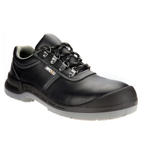 •优质压花牛皮帮面 •全新T系列大底,采用双密度PU,底部贯穿式花纹,可以有效将油污排除,增加防滑性能 •加宽五指包头,专为亚洲人设计,超大内部空间,给脚趾提供最佳舒适体验 •独有防踢鞋头设计 •中低帮可选 •符合中国国标GB21148-2007标准 •尺码:35-47