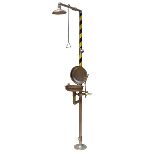 该洗眼器采用不锈钢SS304外层进过特殊工艺处理,可以抗各类化学品物质的腐蚀,该设备配置喷淋部分与洗眼部分,直接安装在工厂现场的地面上,连接饮用自来水;当化学品物质喷溅到工作人员眼部、面部或者身体其他部位的时候,打开复合式洗眼器的喷淋开关,对身体或者服装进行大水量冲洗,或者打开洗眼部分对受伤的眼部、面部进行大水量的冲洗,冲洗时间>15分钟;喷淋水流量:>75.7L/MIN,洗眼/洗脸水流量:>11.4L/MIN,洗眼水流量:>1.5L/MIN。