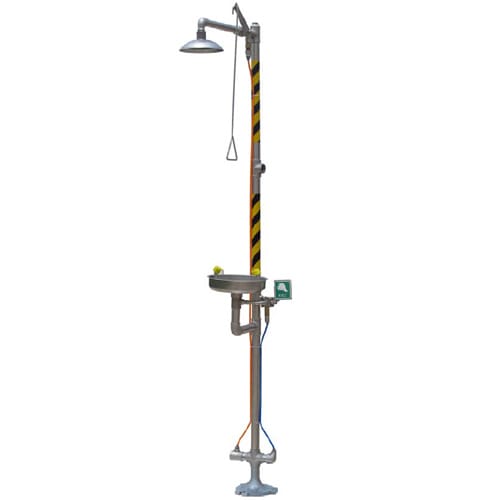 该洗眼器采用先进的温控技术来保证洗眼器具有防冻防热的功能,当工厂现场水源温度为5℃时,防冻型装置开始小流量打开;水源温度高于7℃时自动关闭防冻型装置;当工厂现场水源温度高于30℃时,防热型装置开始小流量打开;水源温度低于28℃时自动关闭防热型装置。该洗眼器在SS304材料外层浸塑ABS,可以抗各类化学品物质的腐蚀,配置喷淋部分与洗眼部分,直接安装在工厂现场的地面上,连接饮用自来水;当化学品物质喷溅到工作人员眼部、面部或者身体其他部位的时候,打开复合式洗眼器的喷淋开关,对身体或者服装进行大水量冲洗,或者打开洗眼部分对受伤的眼部、面部进行大水量的冲洗,冲洗时间>15分钟;喷淋水流量:>75.7L/MIN,洗眼/洗脸水流量:>11.4L/MIN,洗眼水流量:>1.5L/MIN。