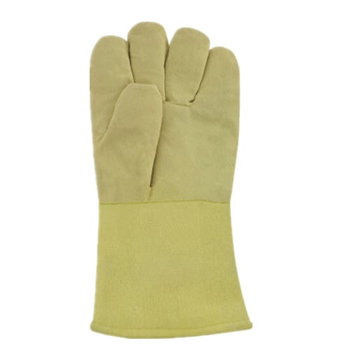 主要面料为对位芳纶的细斜纹编织布(制造防弹衣、消防服和高档刹车片的主要材料),耐温500℃ , 每次持续时间30-40秒;极耐磨损,防刀割,常温下防切割功能达欧盟最高标准5级 ;磨损后无明显浮毛。