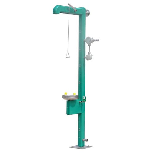 该洗眼器配置喷淋部分与洗眼部分,直接安装在工厂现场的地面上,连接饮用自来水;当化学品物质喷溅到工作人员眼部、面部或者身体其他部位的时候,打开复合式洗眼器的喷淋开关,对身体或者服装进行大水量冲洗,或者打开洗眼部分对受伤的眼部、面部进行大水量的冲洗,冲洗时间>15分钟;喷淋水流量:>75.7L/MIN,洗眼/洗脸水流量:>11.4L/MIN,洗眼水流量:>1.5L/MIN。