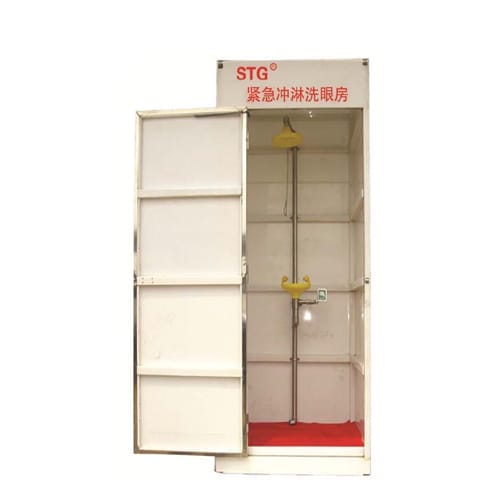 PP抗强腐蚀性喷淋房洗眼站是把洗眼器安装在一个喷淋房里面,防止使用洗眼器的水源喷流到工作现场上,避免造成二次污染。整套装置的设计,满足ANSI Z358-1 2004标准的要求。