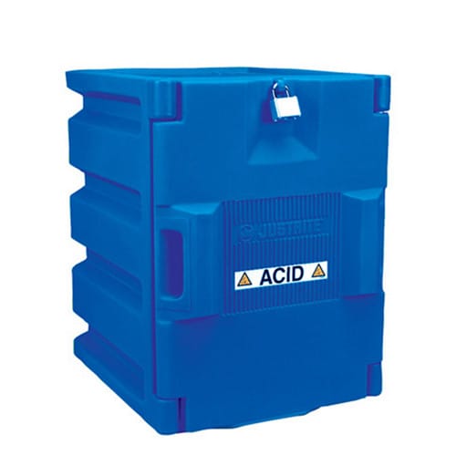 Justrite蓝色聚乙烯安全柜具有极强的耐化学腐蚀和防漏性能,适合存放强腐蚀性的酸。两个型号均设有明显的“ACID”(酸)标签标识内件,并允许使用挂锁(请另购)进一步保障安全。