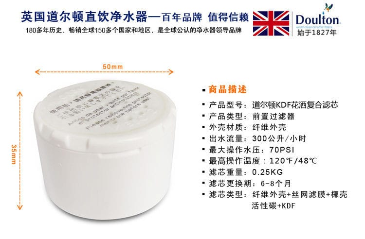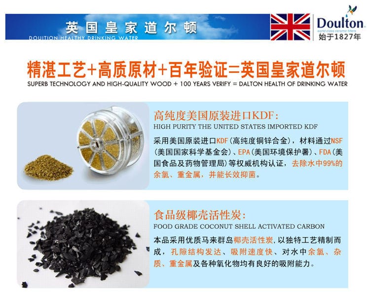 道尔顿采用最先进挤压装活性碳,能有效隔除水中有害的化学品,例如氯气,杀虫剂及农药,有机性物质,石棉纤维,滤除异味,异色及三卤甲烷等致癌物。