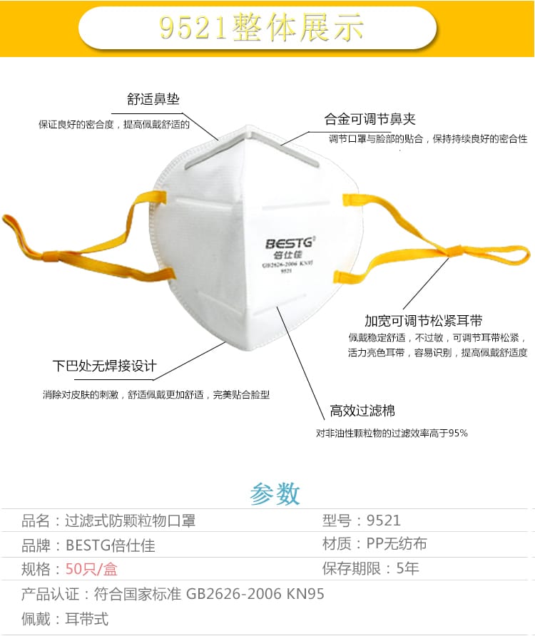 BESTG倍仕佳9521 防尘、防雾霾、防花粉、过滤式、KN95耳带式防颗粒物折叠口罩