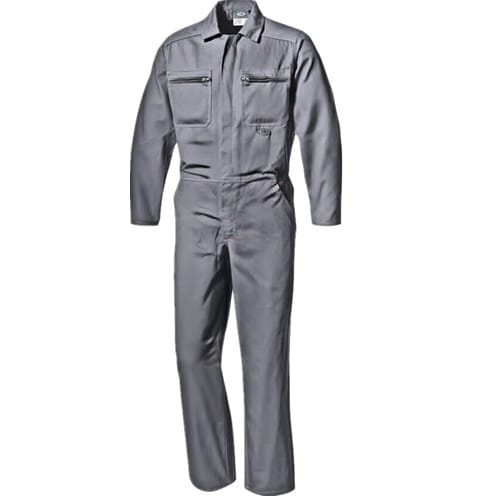 连体服,纯棉,灰色斜纹布,260g/m2,翻边拉链门襟,两个拉链胸袋,一个尺袋,一个后袋,松紧收腰,双线琐式缝合。