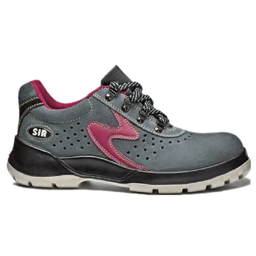 低帮安全鞋,灰色翻毛皮,带透气孔。白色PU鞋底,防砸,防静电,防滑等级SRC。尺码:35-38。