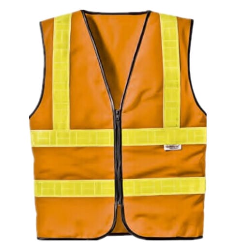 橙色高能见度背心,100%涤纶,170g/m2,拉链前襟,防水反光条。尺码M-3XL。