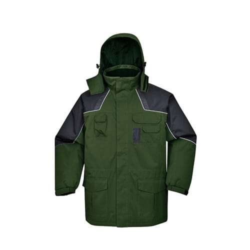 产品简介: ·面料采用300D牛津面料PVC涂层,结实耐磨、防风防雨、穿着舒适; ·面料经防泼水处理,防水3000mm; ·防水接缝,防风前片门襟,多功能口袋设计; ·可调节弹性收紧下摆,弹性袖口可魔术贴粘扣调节大小; ·外夹克与内胆可通过多处连接袢扣连接,防止内胆滑移。 ·前胸后背均采用反光镶边设计 ·前胸工具口袋 ·舒适防刮领贴 ·前肩音频线扣眼时尚设计 ·颜色:绿色+黑色
