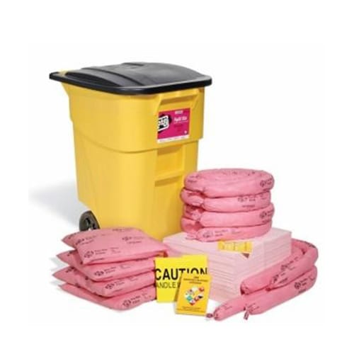 内容物:4 个 8cm x 117cm PIG® 防化学条形吸污垫 • 4 个8cm x 3m PIG® 防化学条形吸污垫 • 70 个 38cm x 51cm PIG® 防化学吸污垫 • 4 个 41cm x 43cm PIG® 防化学枕形吸污垫 • 5 个临时处理袋与封口线 • 6 个防撬标签 1 本紧急情况应对指南,189L滚轮型BRUTE黄色容器