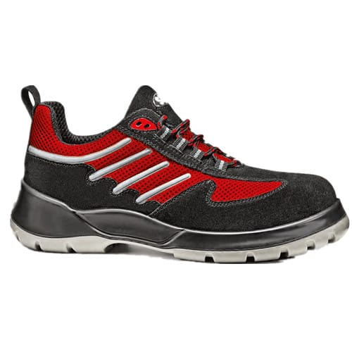 低帮安全鞋,黑色翻毛皮,红色清凉布料镶拼。白色PU鞋底,防砸防穿刺,防静电,防滑等级SRC。尺码:39-46。