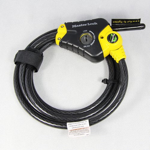 玛斯特锁 ·型号:8413MCND ·材质:铜 产品描述: · 10mm直径,1.8m长钢缆,3种锁紧位置,叶片锁弹 额外规格: 直径:10mm 长度:180cm 产品特性: ·有同花钥匙系列,可换锁胆 ·叶片锁胆增强了防挑锁功能
