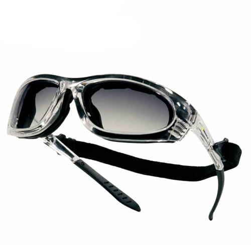 渐变色PC防护眼镜,人体工程设计,弯臂镜脚,弹性织物头带,软质防滑PVC鼻梁架,柔软舒适,可拆卸发泡框架,防尘,防冲击,防紫外线。