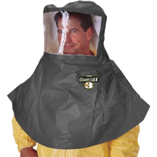 面料: 灰色EVOH防化膜+纺粘聚丙烯无纺布(纺粘PP)---170克/平米 典型应用: 高危害化学品及化学废置物处理;工业拆除作业;石化工业;生化武器典型应用;反恐典型应用等 披肩式防化头罩;PVC面屏;腋下松紧固定