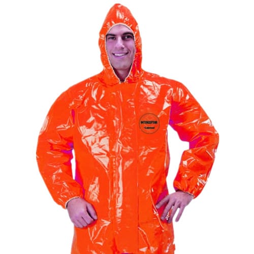 A级气密型防化服 面料:聚合物防化膜-聚酯纤维-聚合物防化膜,每平方米360克重的面料厚度仅为27mil,通过美国ASTM F1001所规定的全部 化学品测试 典型应用:化工生产、消防抢险 颜色:橙色、亮蓝色、暗灰色 含帽兜,手腕、脚裸和面部均采用橡筋收口,正面拉链门襟使用可重复粘合的魔术搭扣。