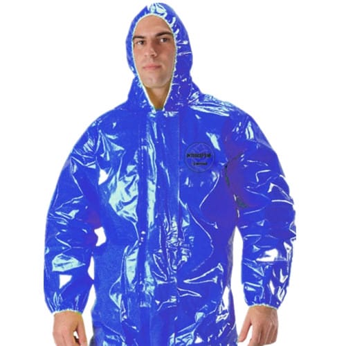 A级气密型防化服 面料:聚合物防化膜-聚酯纤维-聚合物防化膜,每平方米360克重的面料厚度仅为27mil,通过美国ASTM F1001所规定的全部 化学品测试 典型应用:化工生产、消防抢险 颜色:橙色、亮蓝色、暗灰色 连体式设计,含帽兜,面部、手腕均采用橡筋收口,脚部为一体式防化袜套。