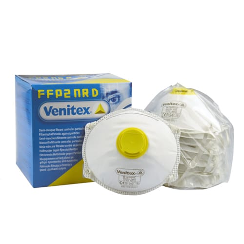 无过敏性合成无纺布口罩,配有阀口,过滤吸收等级FFP2。每盒10只装。