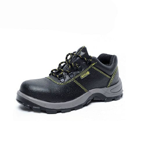 安全鞋,牛皮鞋面。皮革厚度1.8-2.0毫米。新型高品质双密度聚氨酯(PU)注塑鞋底,带钢包头和防穿刺中底。防滑性能