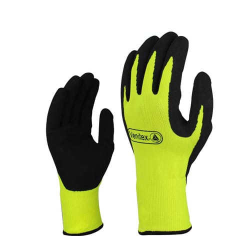 名称:乳胶涂层无缝针织手套 型号:VV733 (201733) 品牌:法国代尔塔 尺寸:8-9 颜色 :荧光黄/黑色涂层 产品描述 : 乳胶涂层无缝针织手套,13针,掌背无涂层,透气舒适,超级柔软内衬,耐磨损、抗撕裂,贴手轻便。 材料 :100%乳胶涂层 使用说明: 通用型防护手套,可对机械风险可以提供较高保护。在干燥环境中使用,远离化学、电、热风险。