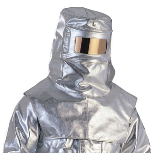 描述:隔热防喷溅头罩,表面覆有镀铝反光薄膜。装于可调节头带上。领口内衬为 Proban.面料。侧面有通风切口。内部为防火Proban.棉制衬料。可更换多层面屏。