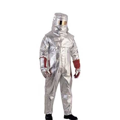 描述:隔热防喷溅连体服,表面覆有镀铝反光薄膜。代尔塔专业化设计。竖领。直袖、直筒裤。内层式拉链,外覆有护边。