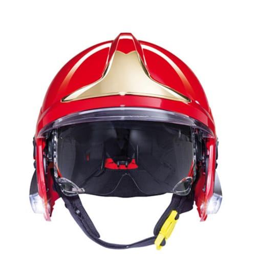 消防头盔F1XF,大号,红色,带照明模组,镀金色面罩,透明眼罩,织带内衬,镀铝披肩,集成照明模组,镀金色面板