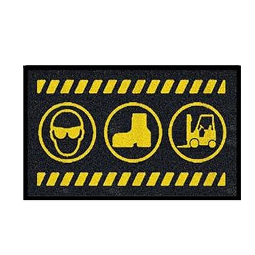 警示必须穿防护鞋、必须使用叉车、 必须带防护眼镜组合标志警示垫; 防污防滑,易清洁; 强力吸水,迅速除湿; 绿色环保材料,抗静电,不助燃。 E'丝圈+发泡底皮;适用于工业场所地面。